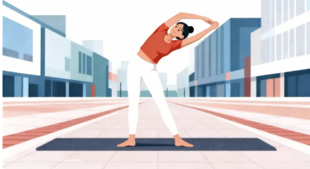 2.側向伸展:站立位,雙腳與肩同寬,雙手交叉舉過頭頂;向左側緩慢彎腰,直到右側腰部有拉伸感(不要扭轉身體),保持15-20秒,回到中立位后換側重復,每側2-3組。