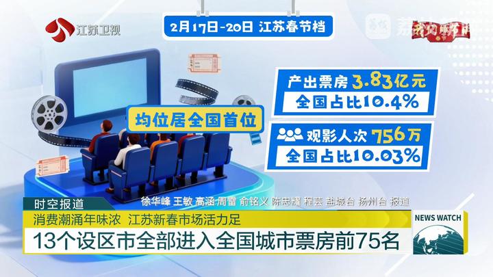 電影票房是文化消費(fèi)活力的風(fēng)向標(biāo)。截至目前,全國(guó)春節(jié)檔電影總票房已突破40億元。作為全國(guó)票倉(cāng),江蘇電影市場(chǎng)持續(xù)領(lǐng)跑全國(guó):2月17日至20日,江蘇產(chǎn)出票房超3.83億元,全國(guó)占比10.4%;觀影人次超756萬(wàn),全國(guó)占比10.03%,票房和人次均位居全國(guó)首位。放眼全國(guó),江蘇展現(xiàn)出“萬(wàn)馬奔騰”的票房趨勢(shì),13個(gè)設(shè)區(qū)市全部進(jìn)入全國(guó)城市票房前75名,蘇州、南京、南通、無(wú)錫、鹽城五市進(jìn)入全國(guó)前20名。