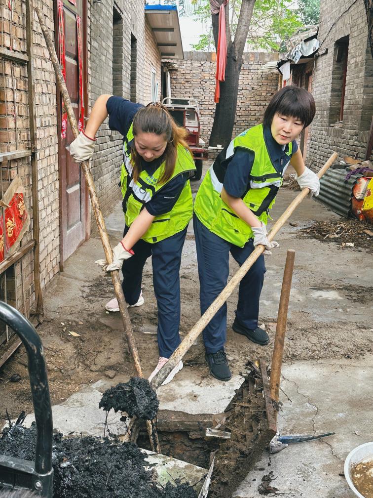 2025年7月,王潤(rùn)梅(右)和同事在清掏下水井。(受訪者供圖)