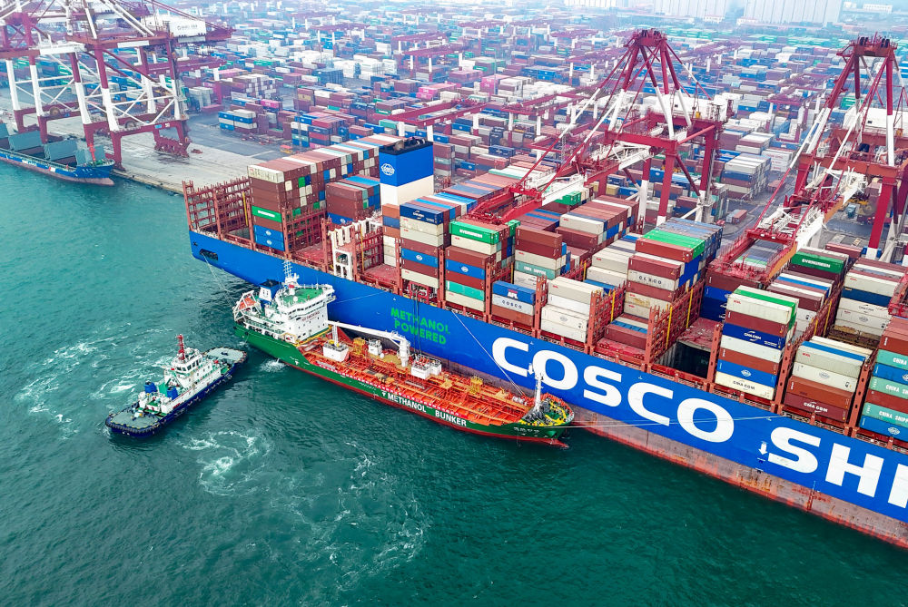 3月2日,在山東港口青島港,甲醇加注船“建航利達”輪為一艘貨輪進行綠色甲醇“船對船”加注作業(yè)(無人機照片)。新華社發(fā)(張進剛攝)