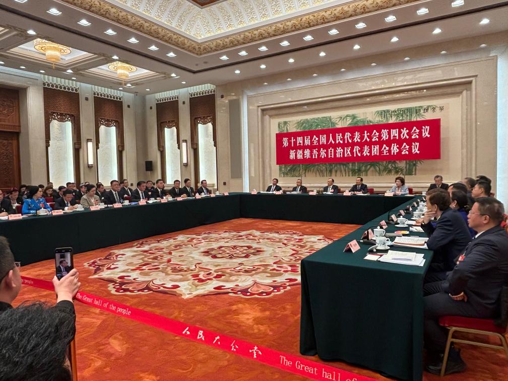 十四屆全國(guó)人大四次會(huì)議新疆維吾爾自治區(qū)代表團(tuán)全體會(huì)議現(xiàn)場(chǎng)。新華社記者 劉雅萱 攝