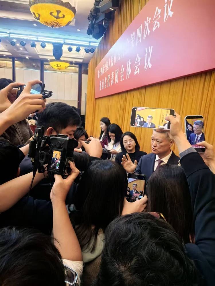 △海南代表團(tuán)開放團(tuán)組活動(dòng),中外媒體記者會(huì)后采訪全國人大代表、海南省人民政府秘書長(zhǎng)蔡強(qiáng) 。林路攝