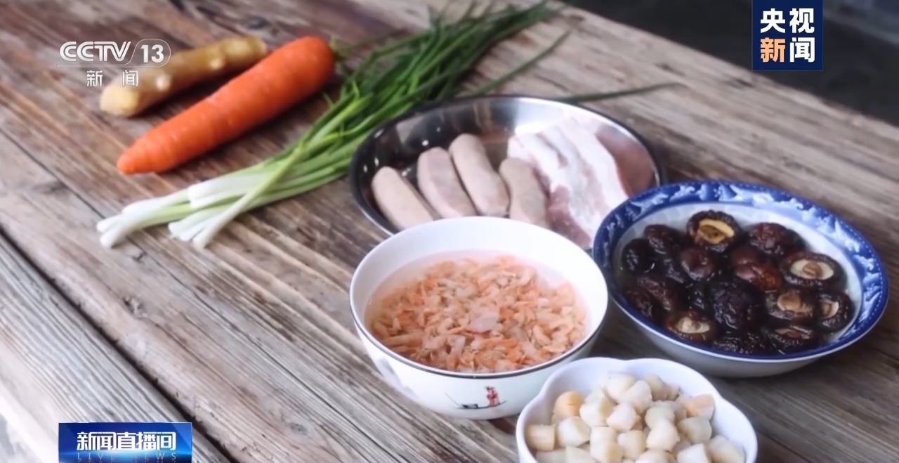 一邊蒸飯,一邊就可以準(zhǔn)備配菜了,五花肉、香菇、干貝、胡蘿卜……這些色彩鮮艷的山珍海味都是芥菜飯的“靈魂”搭配。