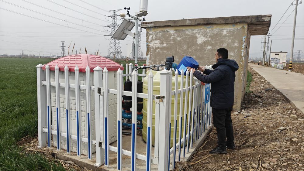 3月18日,在河南省鶴壁市淇縣,當?shù)剞r(nóng)民正在利用水肥一體化設(shè)備為麥田施肥。(王家勝 攝)