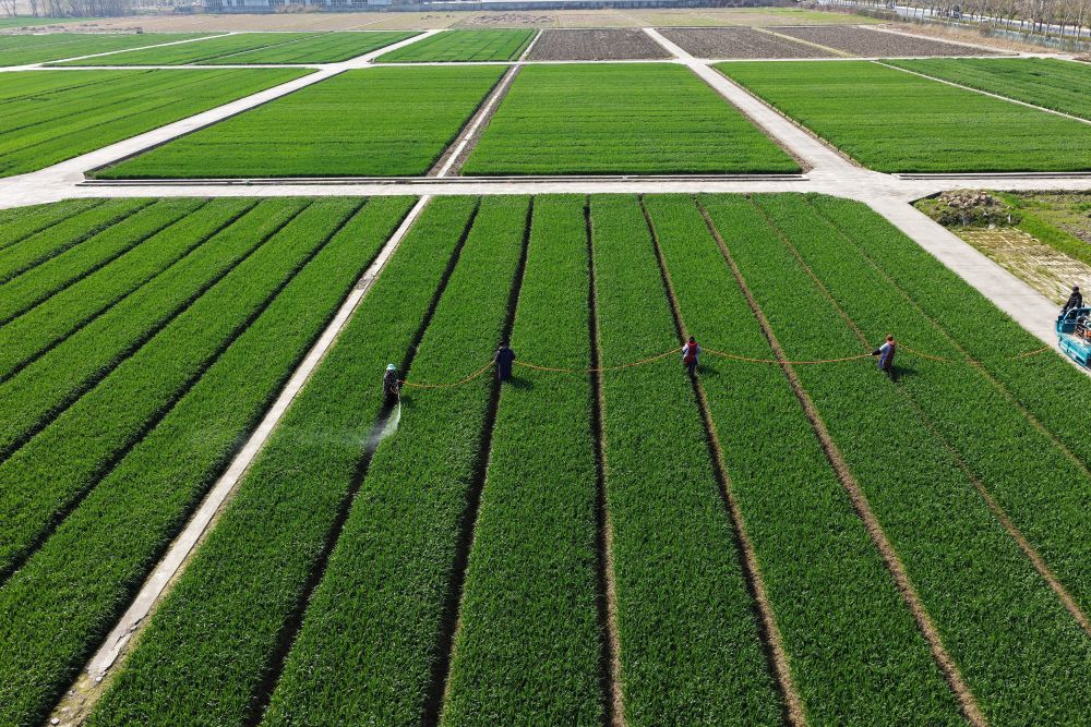 3月10日,農(nóng)民在江蘇里下河地區(qū)農(nóng)科所(揚州市農(nóng)科院)的麥田間噴灑農(nóng)藥(無人機照片)。新華社發(fā)(孟德龍 攝)