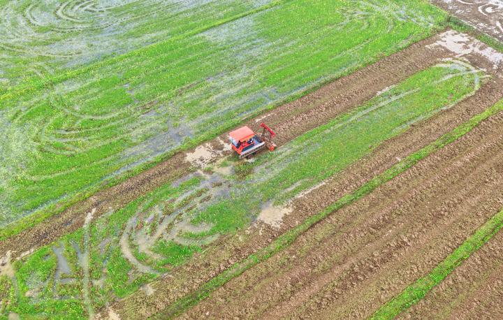 2026年3月20日,在湖南省衡陽市祁東縣金橋鎮(zhèn),村民駕駛農(nóng)機(jī)翻耕稻田(無人機(jī)照片)。新華社發(fā)(曹正平攝)