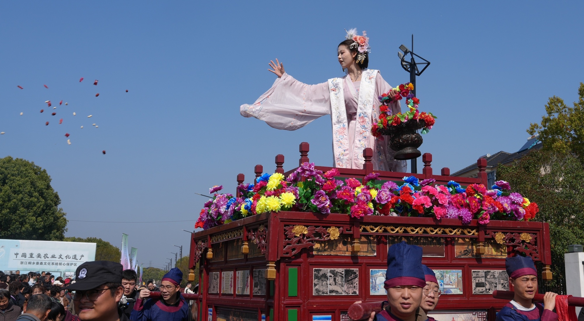 當(dāng)天上午,蠶花“禮”民俗儀式上,每一個環(huán)節(jié)都承載著蠶鄉(xiāng)兒女對風(fēng)調(diào)雨順、蠶花茂盛的美好祈愿。最令人期待的當(dāng)屬民俗巡游展演。來自桐鄉(xiāng)全市各鎮(zhèn)(街道)的民間民俗隊(duì)伍浩浩蕩蕩穿行于村道之間;蠶花仙子與十二花神乘花船翩然而至,沿途撒下寄托祝福的蠶花,與游客互動答題。