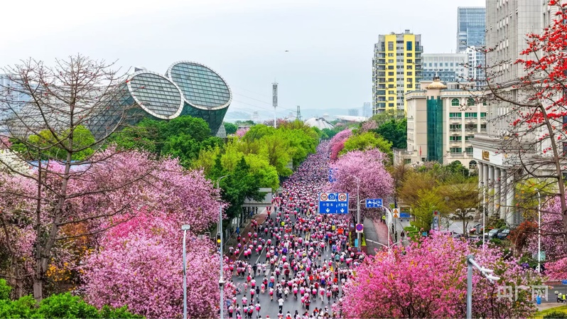 2026柳州全民跑、馬拉松不久前也迎“花”開跑,賽道串聯(lián)起著名地標(biāo)與美景,滿城繁花與蜿蜒柳江、風(fēng)格各異的建筑相映成畫,被跑者們贊道:“每一公里,都有山水作伴、繁花相迎。”