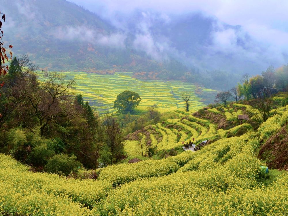 清晨的婺源江嶺景區(qū),晨霧剛剛散去,萬(wàn)畝梯田便在春光里鋪展開來(lái),金黃的油菜花順著山勢(shì)層層疊疊涌向山腳。