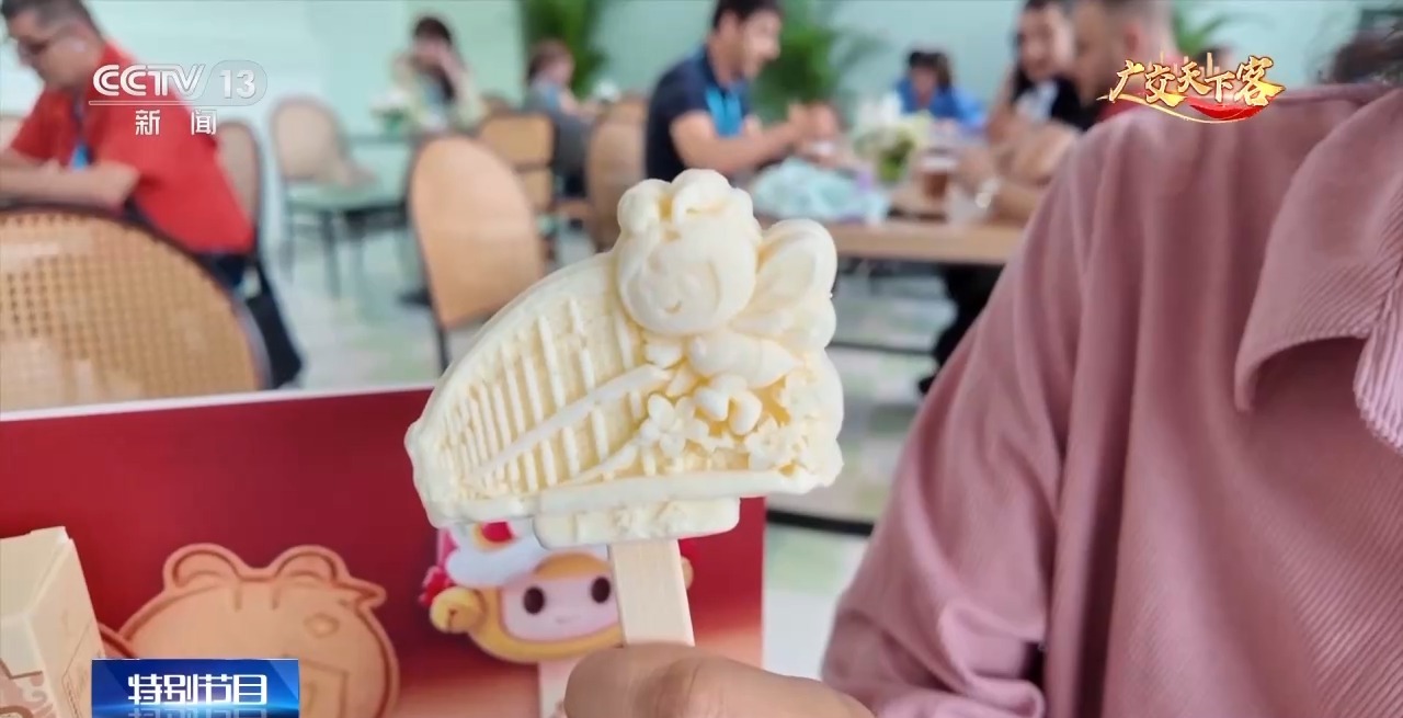 總臺記者 朱解語:新品文創(chuàng)雪糕造型采用的是廣交會展館的元素,結(jié)合了好寶、好妮的萌趣形象,還點綴了廣東特色的木棉花。逛展累了來一口,真是清甜又解暑。新品文創(chuàng)巧克力,它不僅和我們的吉祥物造型相融合,還創(chuàng)造性地運用了廣東醒獅的元素。