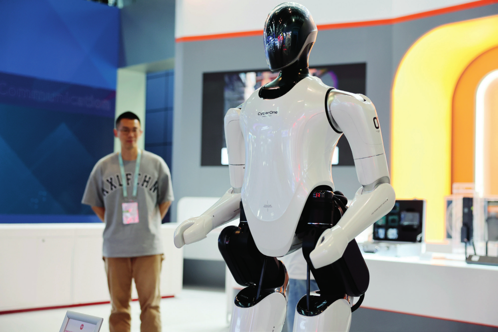 位于中關(guān)村國(guó)家自主創(chuàng)新示范區(qū)展示中心的一款全尺寸人形仿生機(jī)器人(2023 年 5 月 26 日攝)張晨霖?cái)z / 本刊