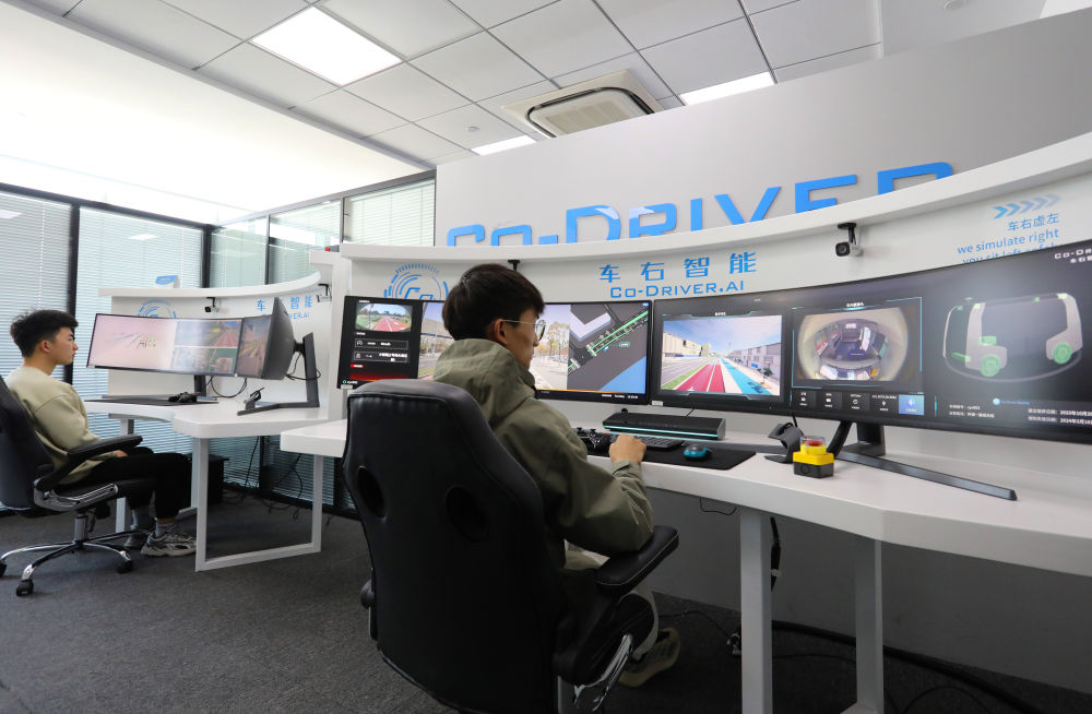 在位于中國(上海)自由貿易試驗區(qū)臨港新片區(qū)的一家智能駕駛企業(yè),工作人員通過無人駕駛汽車遠程監(jiān)管平臺的實時畫面,結合電子地圖對在自動駕駛測試專用路上行駛的車輛進行監(jiān)管(2024年4月9日攝)。