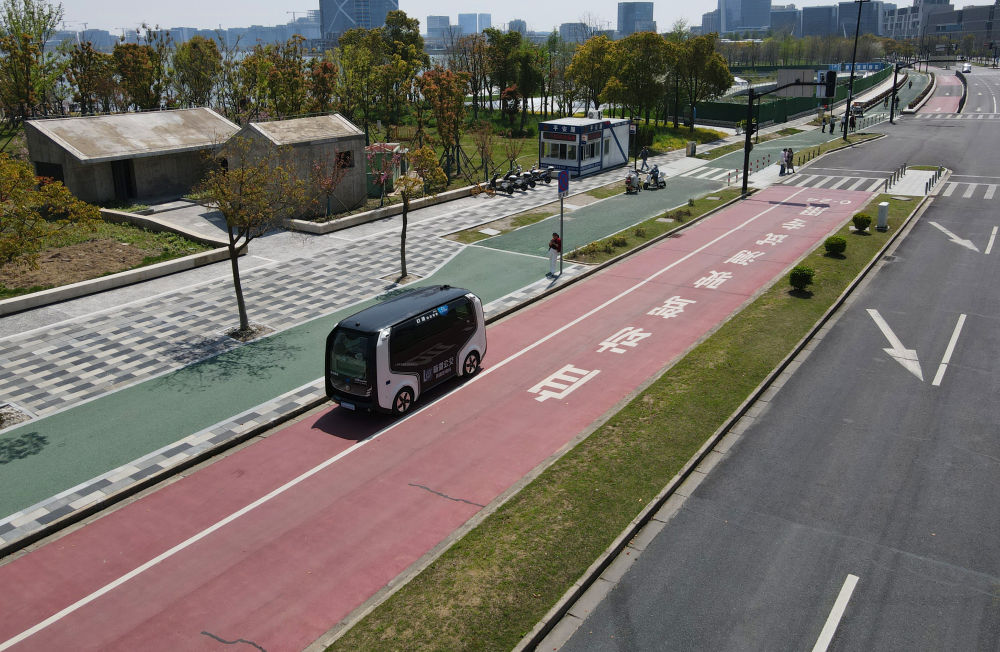 在中國(上海)自由貿易試驗區(qū)臨港新片區(qū),一輛無人駕駛汽車行駛在自動駕駛測試專用路上(無人機照片,2024年4月9日攝)。
