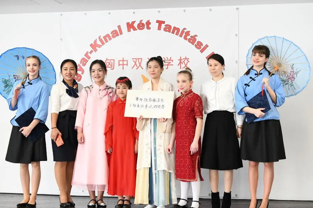 在匈牙利布達(dá)佩斯的匈中雙語學(xué)校,師生們在復(fù)信轉(zhuǎn)交儀式后手持“努力做傳承發(fā)展中匈友好事業(yè)的使者”的標(biāo)語合影。(圖源:新華社)