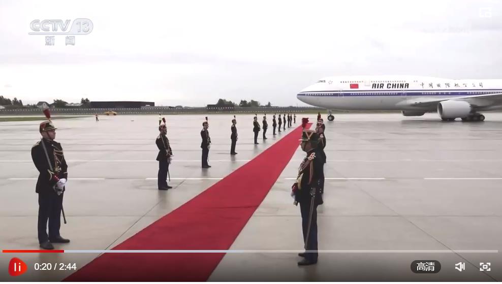 習(xí)近平乘坐專機(jī)抵達(dá)巴黎奧利機(jī)場時(shí),法國總理阿塔爾等法國政府高級代表熱情迎接。