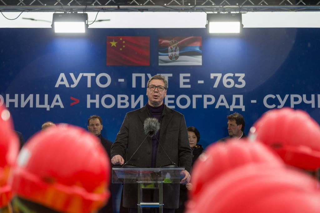 2023年4月1日,塞爾維亞總統(tǒng)武契奇在首都貝爾格萊德的塞爾維亞E763高速公路新貝爾格萊德-蘇爾欽段通車儀式上致辭。新華社記者石中玉攝