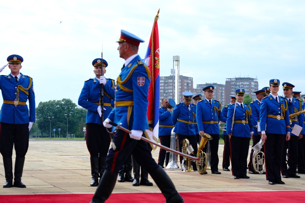 塞爾維亞大廈前,中塞兩國國旗迎風(fēng)飄揚,儀仗隊威武雄壯。