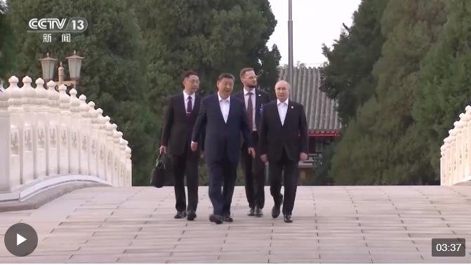 習(xí)近平在瀛臺(tái)橋前迎接普京。兩國(guó)元首邊走邊談,看亭臺(tái)樓榭,賞萬(wàn)物并秀。