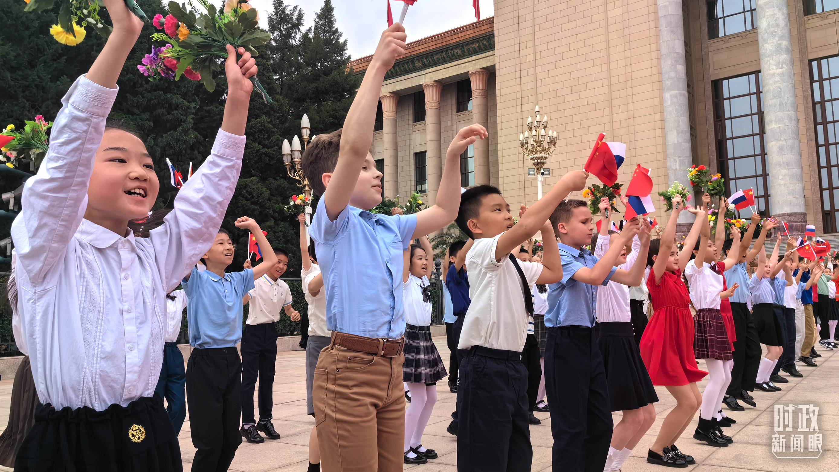 歡迎儀式現(xiàn)場(chǎng)的中俄少年兒童。(總臺(tái)央視記者王子杭、段德文拍攝)