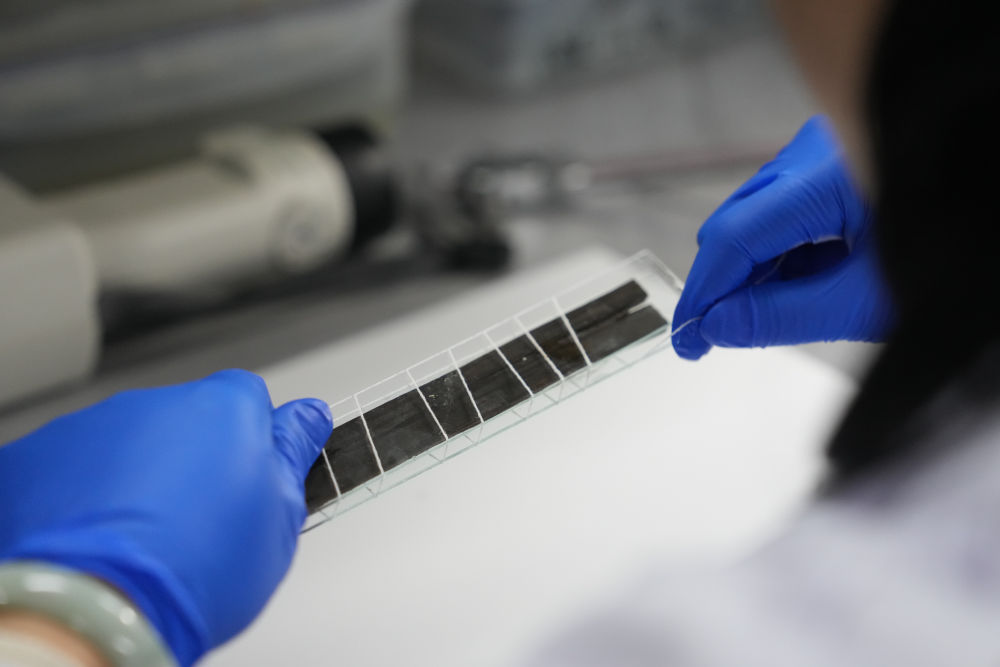 2024年3月4日,工作人員在湖南省文物考古研究院長沙銅官窯基地封護(hù)簡牘。