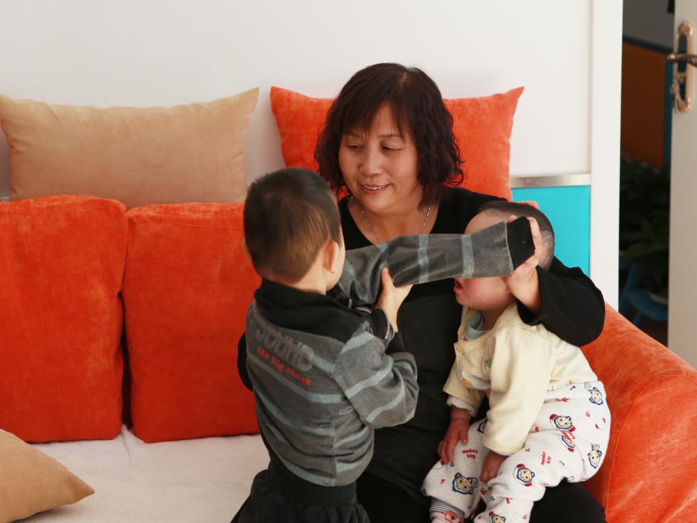 2017年11月3日,內(nèi)蒙古呼和浩特市兒童福利院里,“愛心媽媽”景鳳英抱著兩個孩子。新華社記者 王婧嬙 攝