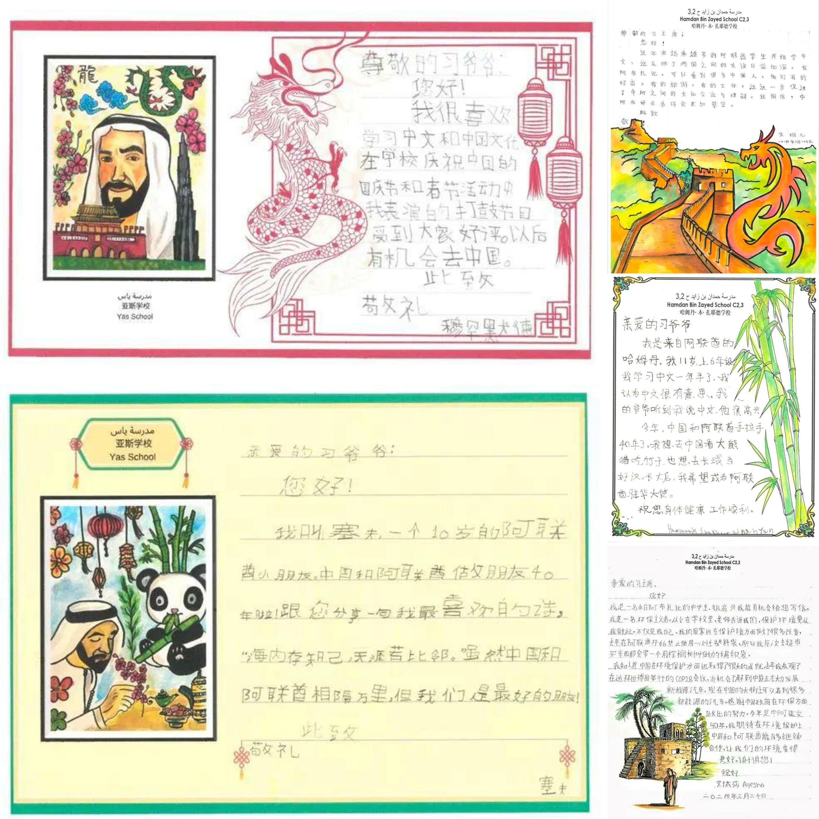不久前,40封書(shū)信從阿聯(lián)酋哈姆丹·本·扎耶德學(xué)校、亞斯學(xué)校寄往北京,收件人是習(xí)近平主席。在這些信箋里,孩子們用中文一筆一畫(huà)講述著中阿友好的故事。他們是阿聯(lián)酋中文教學(xué)“百校項(xiàng)目”學(xué)生代表,代表著阿聯(lián)酋171所開(kāi)設(shè)中文課程的學(xué)校中7.1萬(wàn)名學(xué)習(xí)中文的學(xué)生。