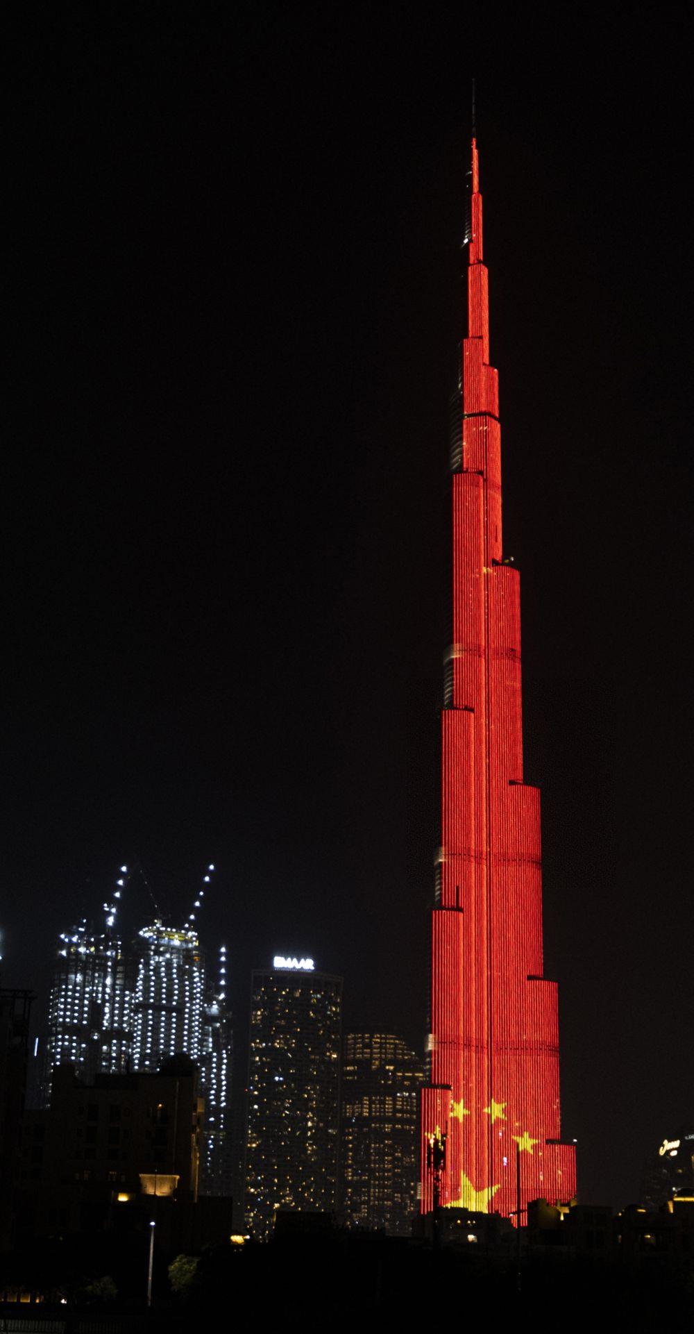 當(dāng)?shù)貢r(shí)間2020年2月2日,在阿聯(lián)酋迪拜,當(dāng)?shù)氐貥?biāo)建筑物哈利法塔點(diǎn)亮中國(guó)國(guó)旗圖案,為中國(guó)抗擊新冠肺炎疫情加油。