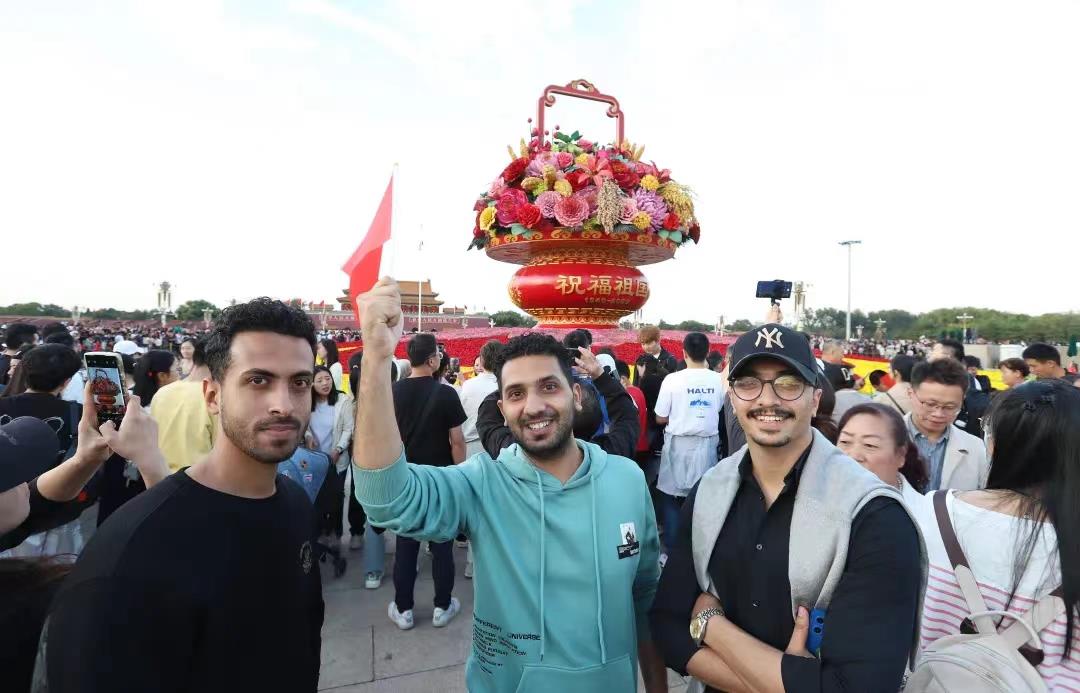 2023年10月1日,三位來(lái)自阿爾及利亞的游客在北京天安門(mén)廣場(chǎng)“祝福祖國(guó)”巨型花籃前留影。