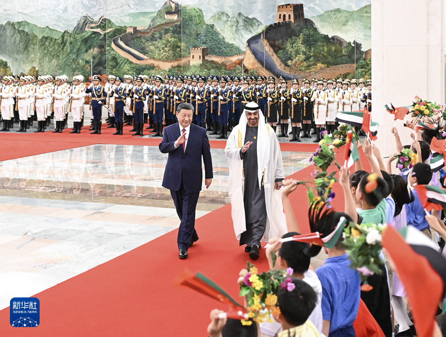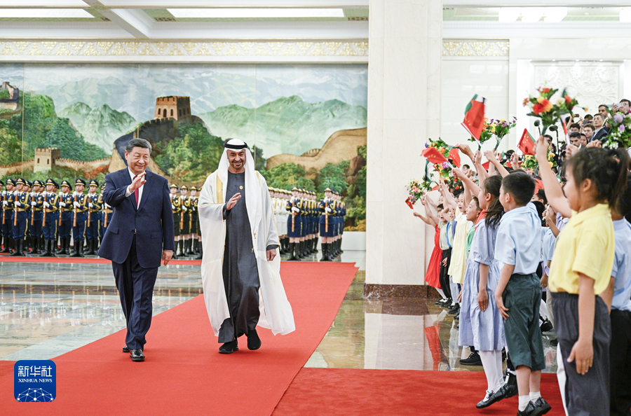 5月30日下午,國家主席習(xí)近平在北京人民大會堂同來華國事訪問并出席中國-阿拉伯國家合作論壇第十屆部長級會議開幕式的阿聯(lián)酋總統(tǒng)穆罕默德舉行會談。這是會談前,習(xí)近平在人民大會堂北大廳為穆罕默德舉行歡迎儀式。新華社記者 饒愛民 攝