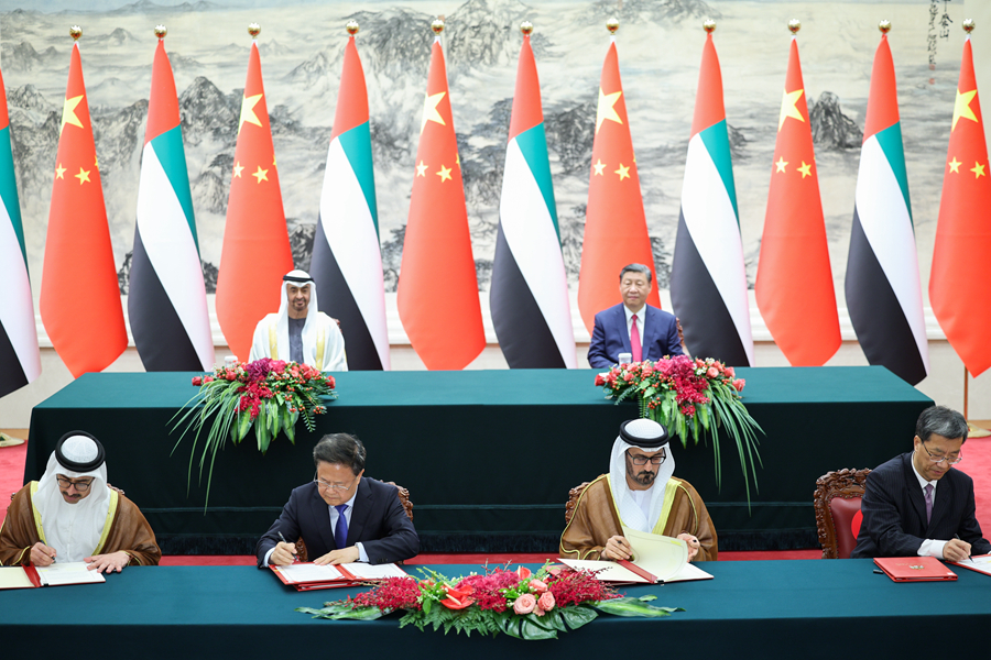 5月30日下午,國家主席習(xí)近平在北京人民大會堂同來華國事訪問并出席中國-阿拉伯國家合作論壇第十屆部長級會議開幕式的阿聯(lián)酋總統(tǒng)穆罕默德舉行會談。這是會談后,兩國元首共同見證簽署多項雙邊合作文件。新華社記者 劉彬 攝