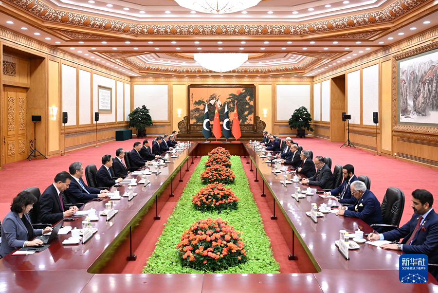 6月7日下午,國家主席習(xí)近平在北京人民大會堂會見來華正式訪問的巴基斯坦總理夏巴茲。新華社記者 申宏 攝
