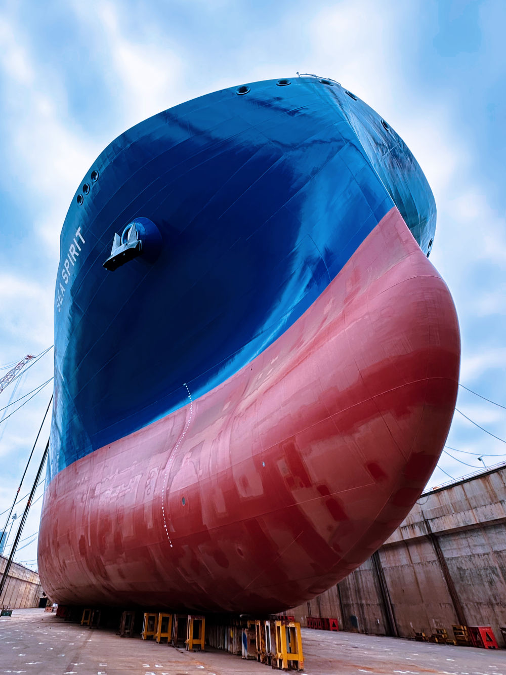 ?。对碌拇筮B,碧海流云。中國船舶集團大連船舶重工集團有限公司(簡稱“中國船舶大連造船”)一艘正在建造的17.5萬立方米LNG運輸船停靠在碼頭,400多名工人上上下下,正在進行貨物圍護系統(tǒng)的施工。