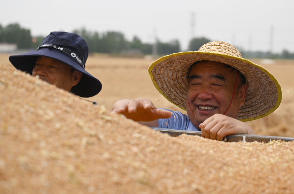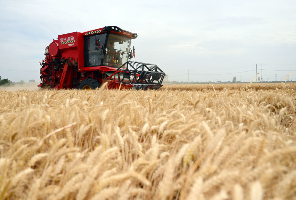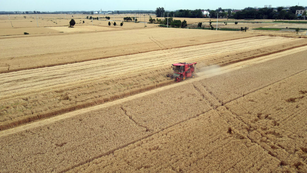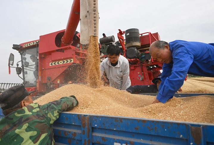 麥?zhǔn)諘r(shí)節(jié),在安徽阜陽(yáng)太和縣,機(jī)器轟鳴,麥浪翻滾如金色綢緞,飽滿的麥粒裝滿一輛輛運(yùn)糧車的貨廂。