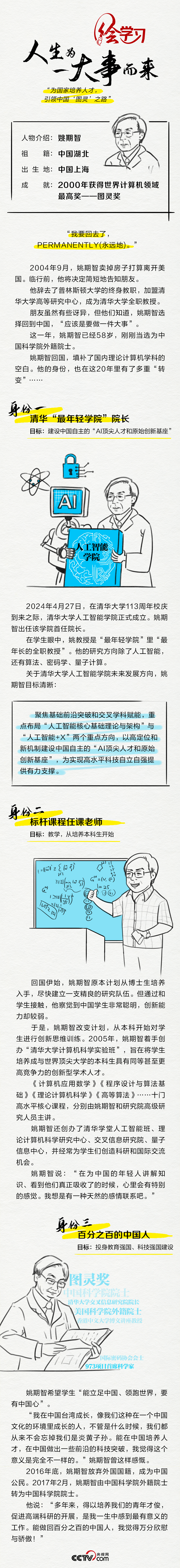 作為一名計(jì)算機(jī)科學(xué)專家,姚期智是圖靈獎(jiǎng)創(chuàng)立以來首位亞裔獲獎(jiǎng)?wù)?,也是世界現(xiàn)代密碼學(xué)基礎(chǔ)的奠基人之一。2004年,姚期智辭去美國普林斯頓大學(xué)終身教職,回國到清華大學(xué)全職任教。他曾說,“人生為一大事而來”。這件大事,就是“為國家培養(yǎng)人才,引領(lǐng)中國‘圖靈’之路”。央視網(wǎng)《天天學(xué)習(xí)》欄目推出手繪長圖,為您講述姚期智將愛國之情化為報(bào)國之行的奮斗故事。