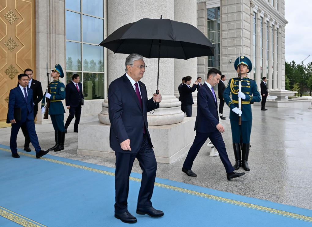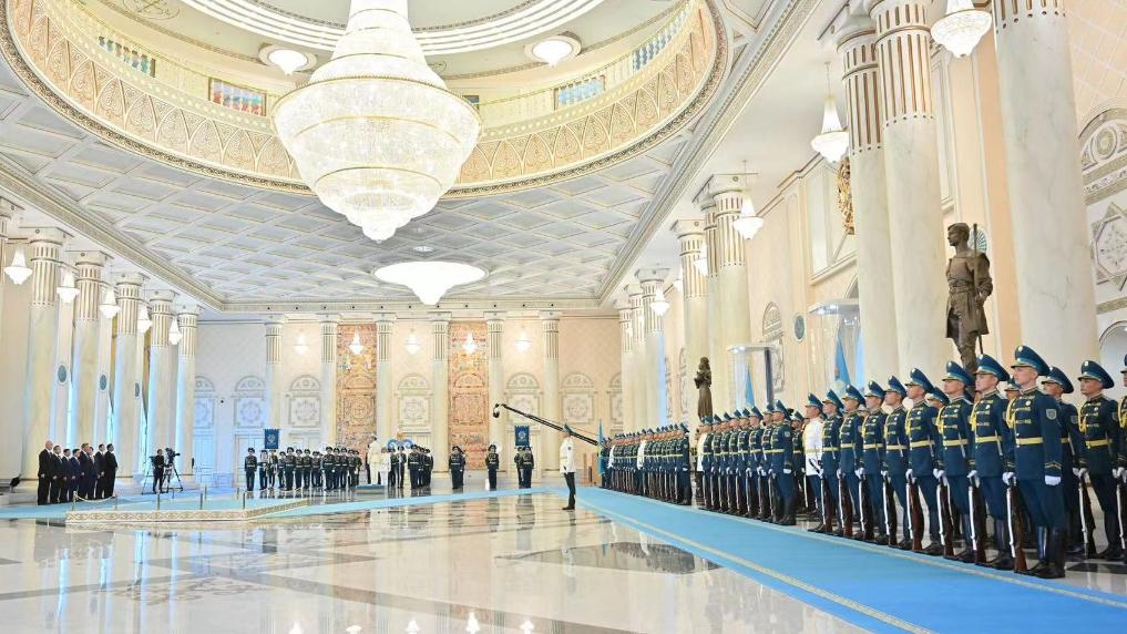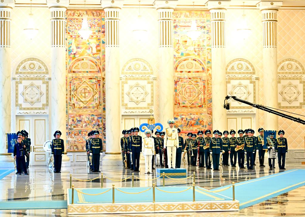 托卡耶夫?yàn)榱?xí)近平舉行隆重歡迎儀式??偨y(tǒng)府大廳氣勢(shì)恢宏,禮兵威武挺拔。兩國(guó)元首分別同對(duì)方陪同人員一一握手致意。兩國(guó)元首登上檢閱臺(tái),軍樂(lè)團(tuán)奏中哈兩國(guó)國(guó)歌。習(xí)近平在托卡耶夫陪同下檢閱儀仗隊(duì)。