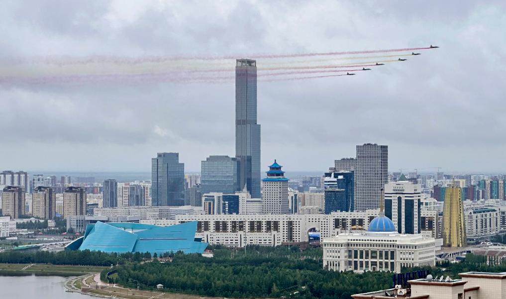 當(dāng)?shù)貢r(shí)間7月3日,國(guó)家主席習(xí)近平在阿斯塔納出席哈薩克斯坦總統(tǒng)托卡耶夫舉行的歡迎儀式。習(xí)近平乘車抵達(dá)總統(tǒng)府時(shí),托卡耶夫總統(tǒng)熱情迎接。六架哈薩克斯坦空軍戰(zhàn)機(jī)從總統(tǒng)府上空飛過(guò),拉出象征中國(guó)國(guó)旗的紅黃色彩煙,以最高禮儀歡迎習(xí)近平對(duì)哈薩克斯坦進(jìn)行國(guó)事訪問(wèn)。