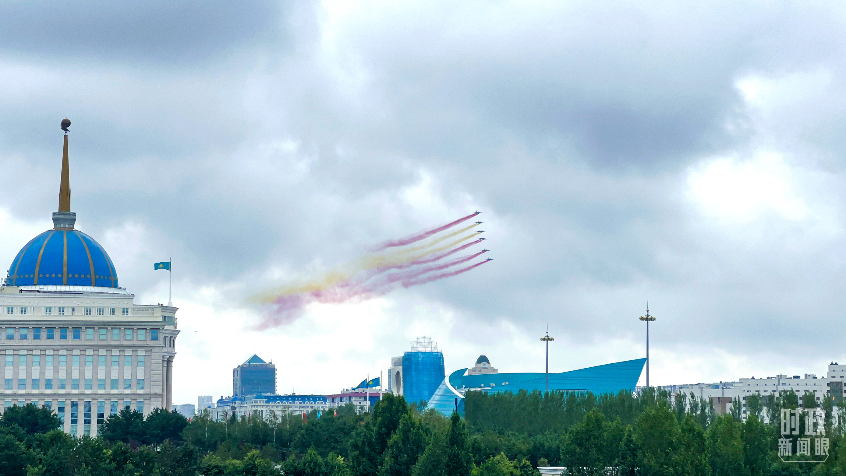 習(xí)主席乘車抵達(dá)哈總統(tǒng)府時,托卡耶夫總統(tǒng)熱情迎接。六架哈薩克斯坦空軍戰(zhàn)機(jī)從總統(tǒng)府上空飛過,拉出象征中國國旗色彩的紅黃色彩煙,以最高禮儀歡迎中國貴賓。