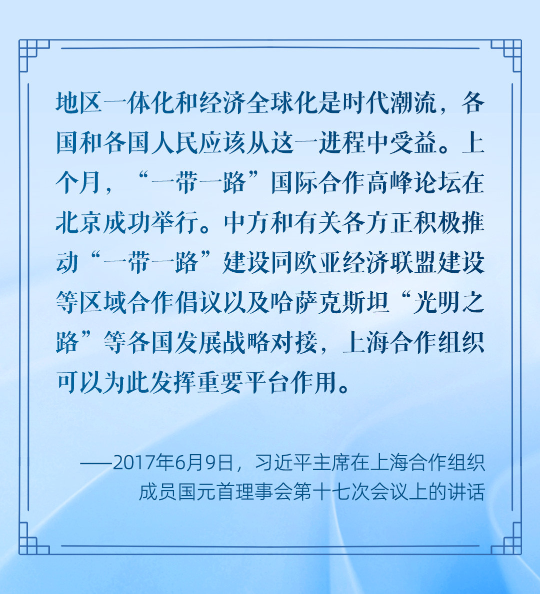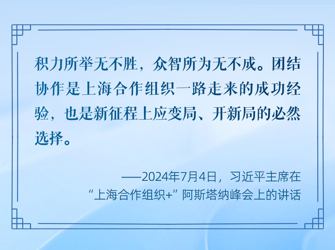 在上海合作組織這個世界上人口最多、幅員最遼闊的大家庭,好鄰居心連心、好朋友肩并肩、好伙伴手牽手,不斷拓展互利合作、共同發(fā)展的廣闊空間,朝著實現(xiàn)現(xiàn)代化的宏偉藍圖,在可持續(xù)發(fā)展之路上不斷邁進。