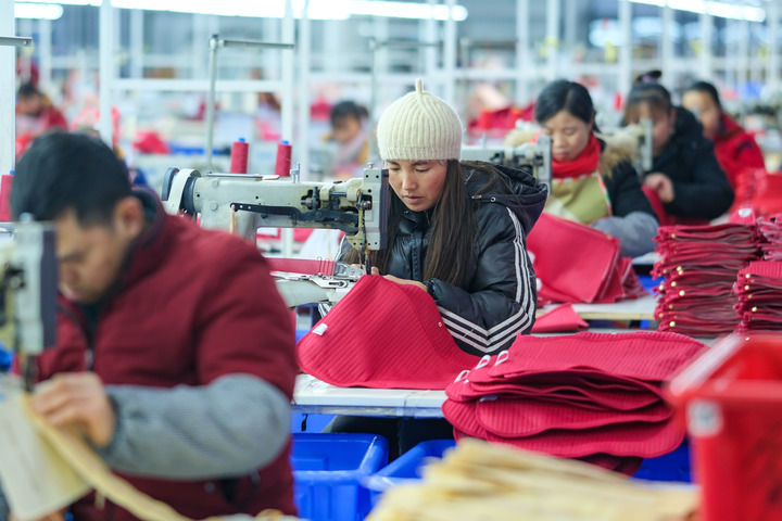 2024年1月18日,社區(qū)居民在紅安社區(qū)的鄉(xiāng)村振興就業(yè)車間工作。紅安社區(qū)是由易地搬遷安置區(qū)單獨(dú)成立的新社區(qū),位于湖南省湘西土家族苗族自治州鳳凰縣禾庫鎮(zhèn)。