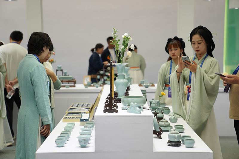 2023年10月18日,人們在2023中國景德鎮(zhèn)國際陶瓷博覽會汝窯展臺參觀。