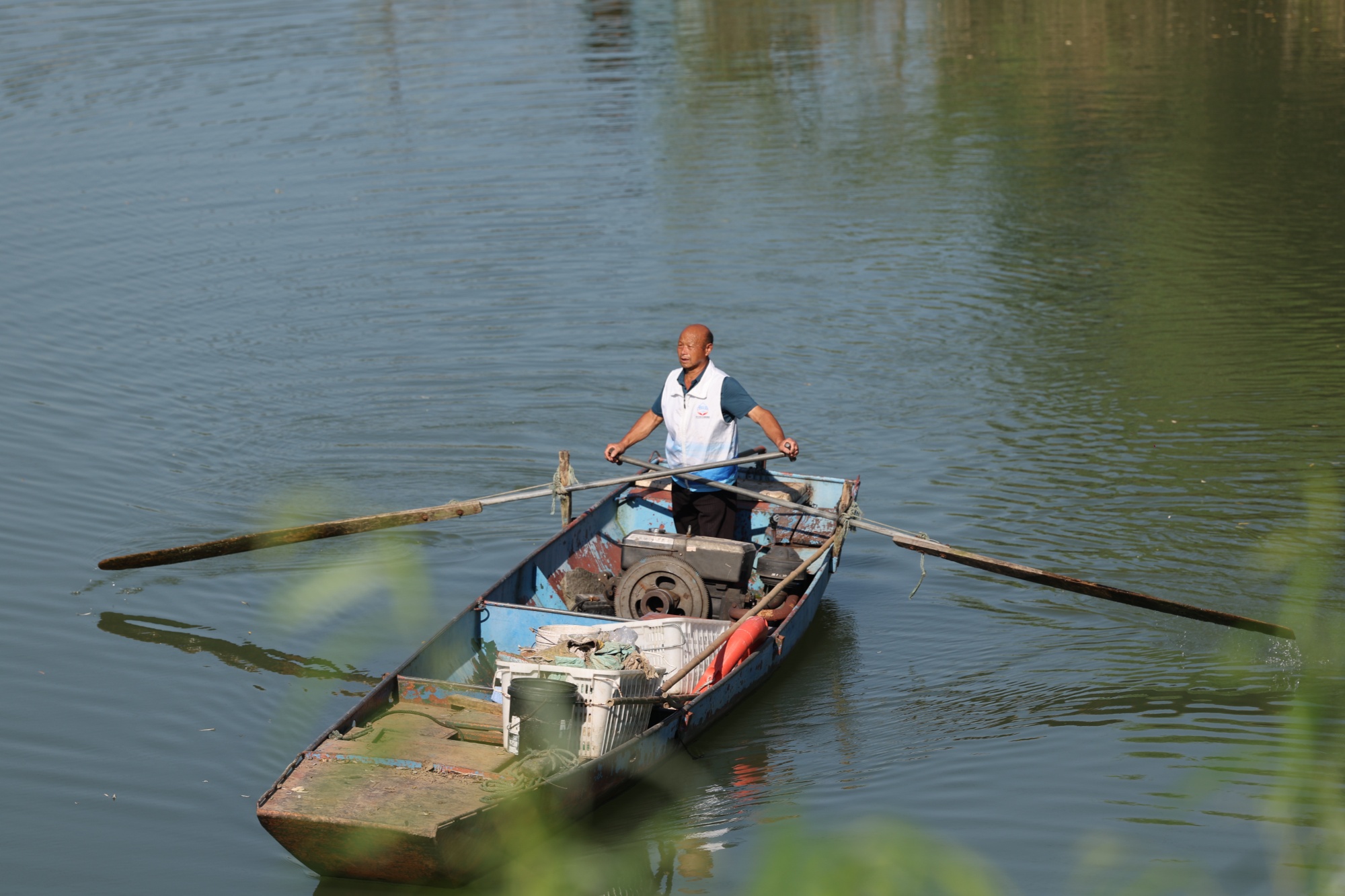 2020年,長江流域重點水域“十年禁漁”全面啟動,老蔣積極響應(yīng),主動上交跟了自己半輩子的9條漁船。后來,為了發(fā)揮他熟悉水域、水性好的特長,當(dāng)?shù)卣疄樗渲昧艘粭l“守井衛(wèi)士”船,用于巡江清漂和水上救援。