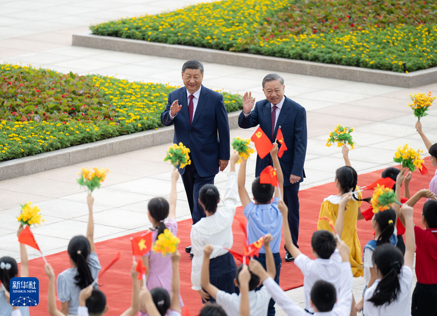 8月19日,中共中央總書記、國(guó)家主席習(xí)近平在北京人民大會(huì)堂同來(lái)華進(jìn)行國(guó)事訪問(wèn)的越共中央總書記、國(guó)家主席蘇林舉行會(huì)談。這是會(huì)談前,習(xí)近平在人民大會(huì)堂東門外廣場(chǎng)為蘇林舉行歡迎儀式。新華社記者 翟健嵐 攝