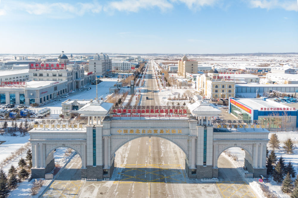 這是2024年1月31日拍攝的中國(黑龍江)自由貿(mào)易試驗區(qū)黑河片區(qū)(無人機照片)。五年來,中國(黑龍江)自由貿(mào)易試驗區(qū)將“試驗田”種成“高產(chǎn)田”,以全省萬分之三的面積,貢獻了全省約五分之一的實際使用外資和七分之一的外貿(mào)進出口,在對外合作、降低物流成本、培育特色產(chǎn)業(yè)和新業(yè)態(tài)新模式等方面深入探索,成功產(chǎn)出超過300項制度創(chuàng)新成果。
