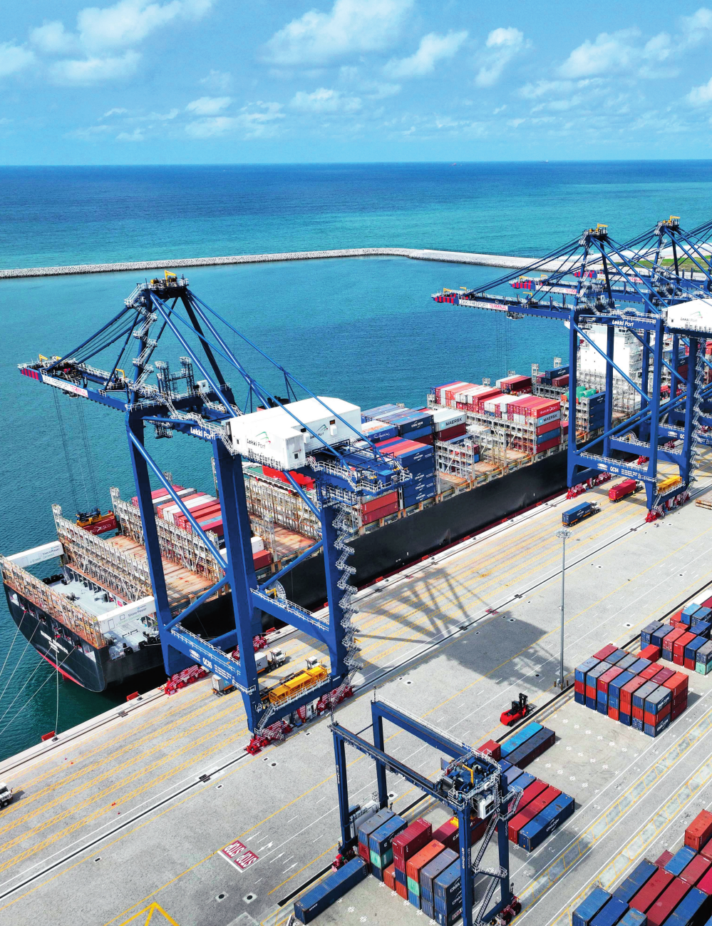 由中國(guó)港灣工程有限責(zé)任公司承建的尼日利亞萊基深水港位于中尼合作建設(shè)的拉各斯萊基自貿(mào)區(qū)內(nèi),是尼日利亞首個(gè)現(xiàn)代化深水港和最大港口。圖為一艘貨輪在尼日利亞拉各斯萊基深水港裝卸集裝箱(2024 年 3 月 11 日攝)萊基港公司供圖