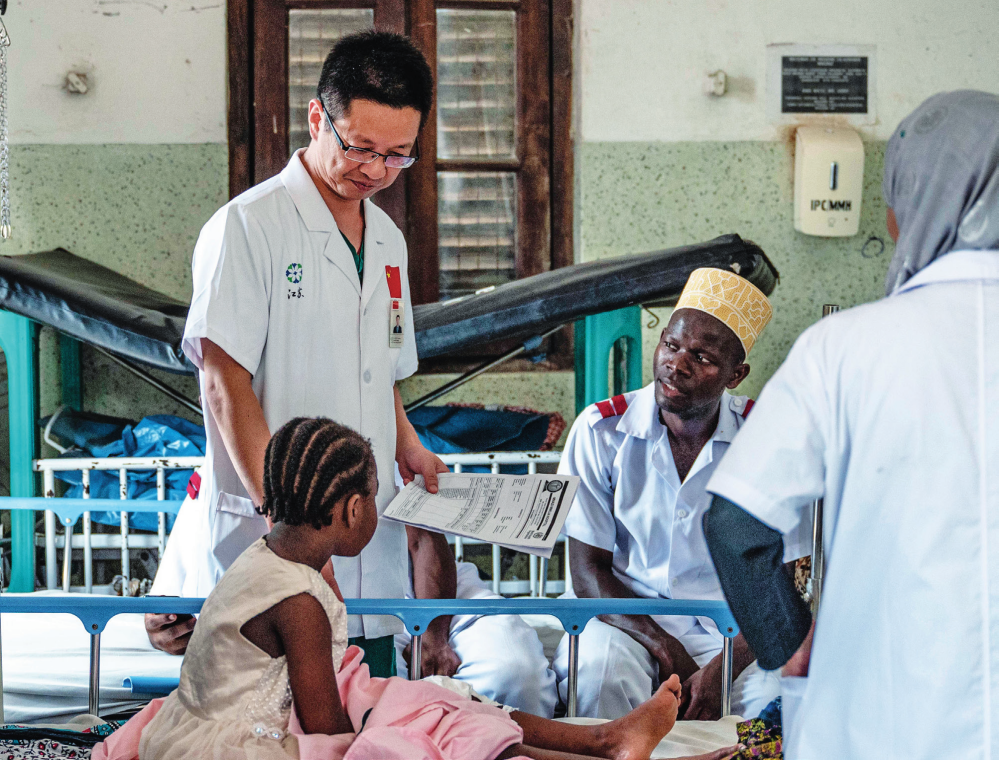 中國(guó)援桑給巴爾醫(yī)療隊(duì)隊(duì)長(zhǎng)蔣國(guó)慶(左)在坦桑尼亞桑給巴爾的納茲莫加醫(yī)院查房(2023 年 12 月 29 日攝)王冠森攝 / 本刊