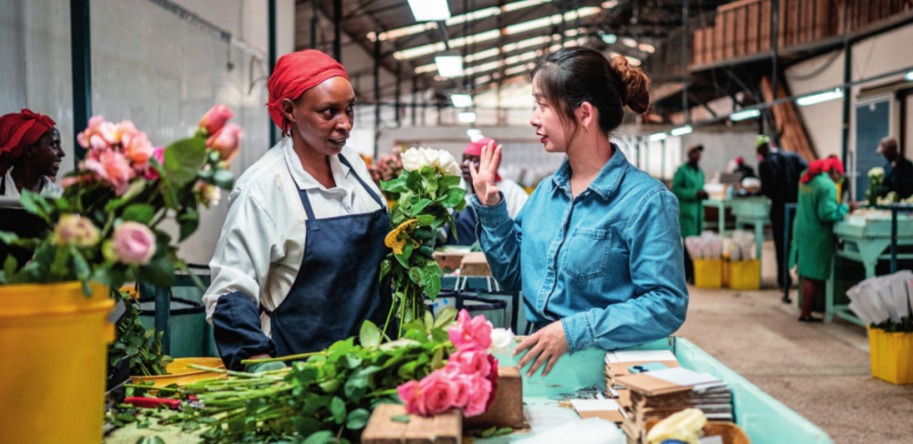 湖南璽悅國(guó)際貿(mào)易有限公司負(fù)責(zé)人黃梓楠(右)在肯尼亞納紐基的坦布濟(jì)花卉農(nóng)場(chǎng)挑選鮮花(2024年5月18日攝)王冠森攝 / 本刊