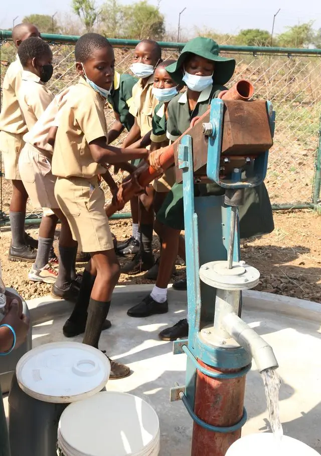 2021年11月,在津巴布韋南馬塔貝萊蘭省省會關(guān)達的塞農(nóng)多小學(xué),學(xué)生從中國援建水井里打水。