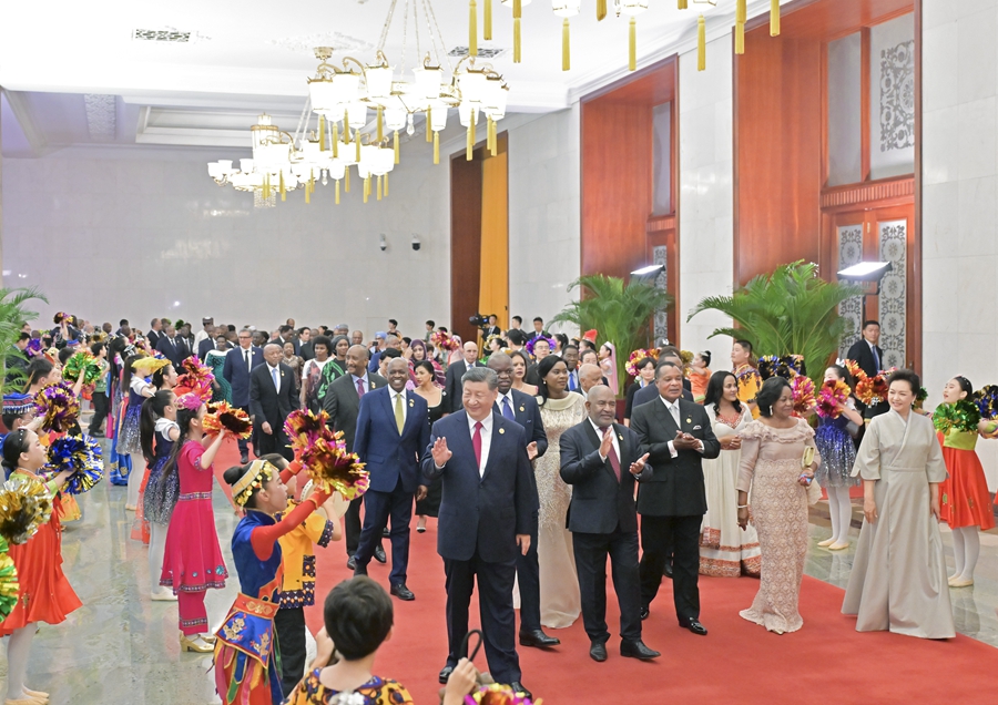 宴會后,習(xí)近平和彭麗媛同貴賓們共同觀看《攜手同行,共筑未來》文藝演出。演出展現(xiàn)了中非多彩文明美美與共、中非人民相知相親,贏得陣陣熱烈掌聲。