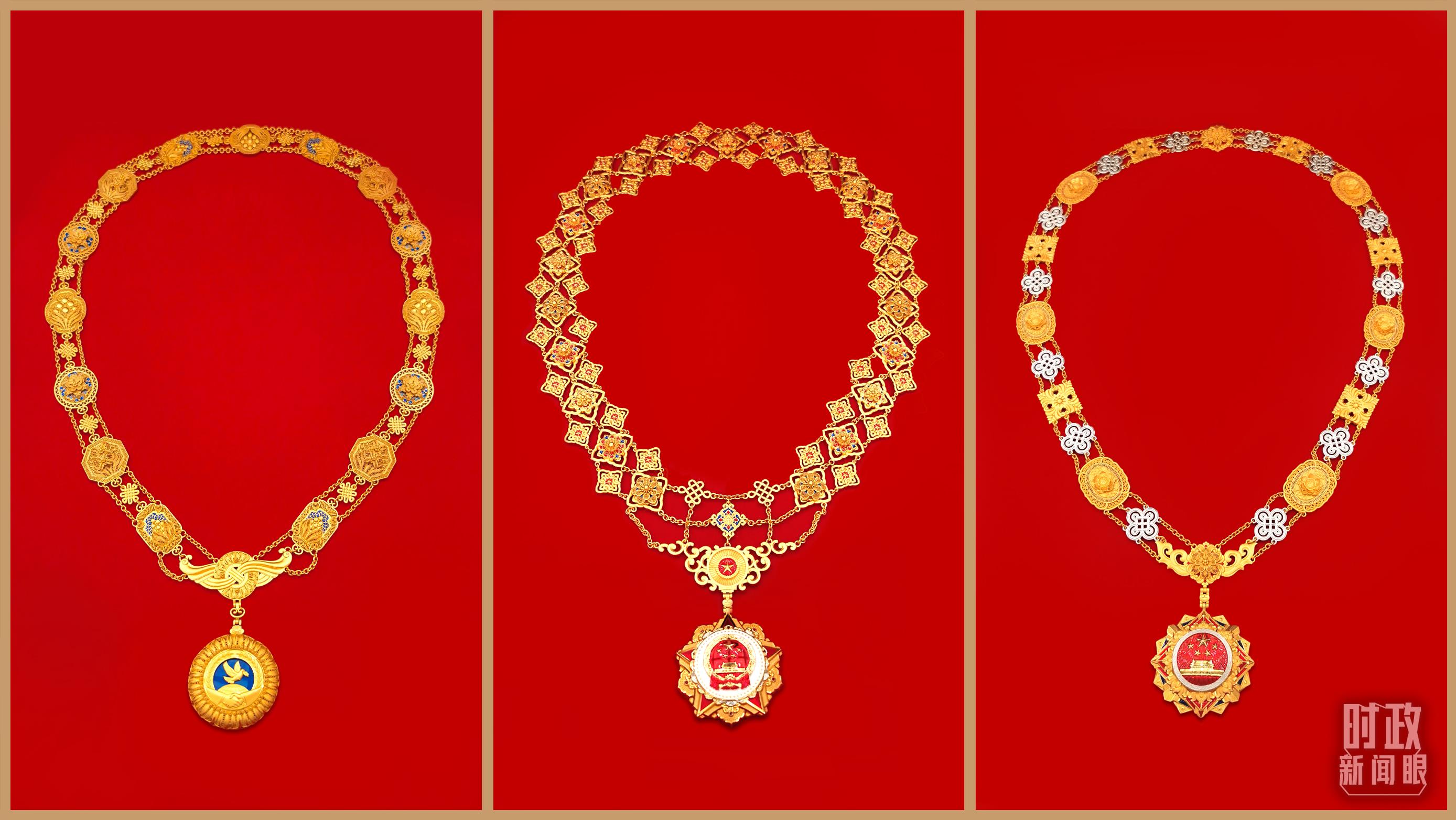 “共和國勛章”(中)、“友誼勛章”(左)和國家榮譽(yù)稱號獎?wù)拢ㄓ遥#偱_央視記者郭鴻、鄂介甫拍攝)