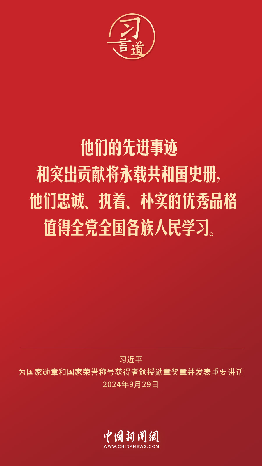 經(jīng)中共中央批準(zhǔn),中華人民共和國國家勛章和國家榮譽稱號頒授儀式于9月29日上午10時在人民大會堂隆重舉行。中共中央總書記、國家主席、中央軍委主席習(xí)近平向國家勛章和國家榮譽稱號獲得者分別授予“共和國勛章”“友誼勛章”和國家榮譽稱號獎?wù)虏l(fā)表重要講話。習(xí)近平指出——